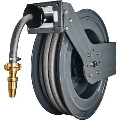 Der Schlauchaufroller verfügt über einen automatischen Rückzug, der sich stufenweise arretieren lässt, sodass der Schlauch immer auf der gewünschten Länge bleibt. Schlauchschutz und Schlauchstopper gewährleisten eine sichere und komfortable Handhabung.
